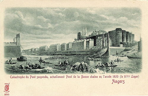 En 1850, une troupe militaire traverse au pas un pont suspendu à Angers.